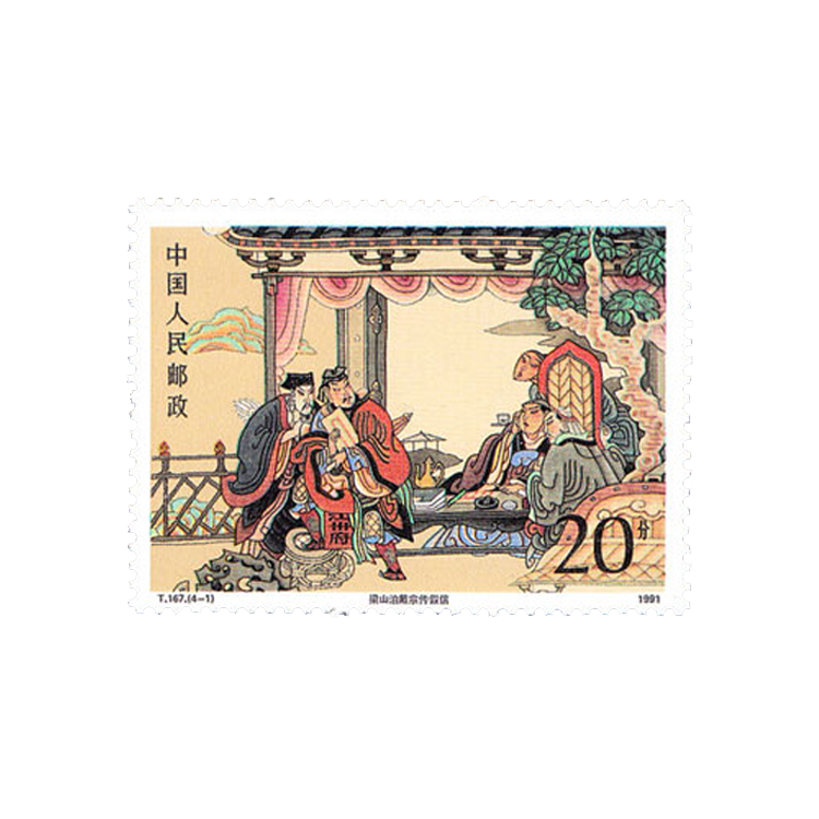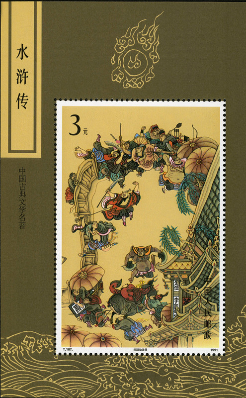 1991年11月19日发行了第三组中国古典文学名著《水浒传》特种邮票,编号T167,全套4枚邮票,1枚小型张。这套《水浒传》第三组邮票,选取书中第39回至50回的五段故事。