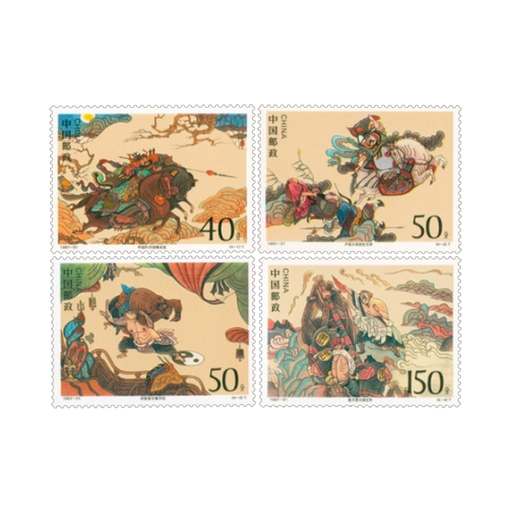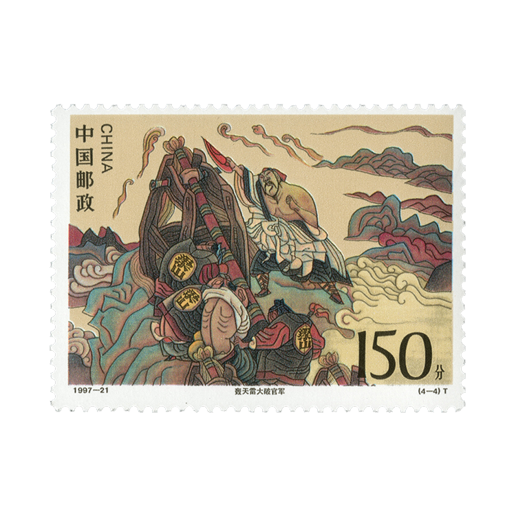 (4-4)图为“轰天雷大破官军”。面值150分,2814.3万枚。选自《水浒传》第77回至80回。梁山泊英雄排座次后,声威大振,使朝廷大为惊恐,急忙派太尉陈宗善前往梁山招安,被李逵扯碎诏书,陈太尉抱头鼠窜而去。于是,朝廷又派枢密使童贯和太尉高俅率大队人马前去征讨。梁山好汉设下九宫八卦阵,使用十面埋伏计,二赢童贯,三败高俅,大败官军。特别是轰天雷凌振制造的火炮在战斗中大显神威,真是“炮似轰雷山石裂,绿林深处显戈矛”,使官军几乎全军复没。