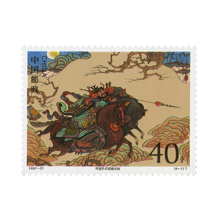 (4-1)图为“呼延灼月夜赚关胜”。面值40分,发行2674.3万枚。选自第六十三回“呼延灼月夜赚关胜,宋公明雪天擒索超”。呼延灼和关胜原都是朝廷命官,先后被派去征剿梁山好汉,归降了梁山的呼延灼按军师吴用之计,假意重新归降朝廷,骗得关胜的信任,将其引入梁山好汉的包围圈里活捉,还以自己的现身说法说服关胜入伙。画面描绘了双鞭呼延灼和大刀关胜并辔而行,奔向梁山营寨的情景。
