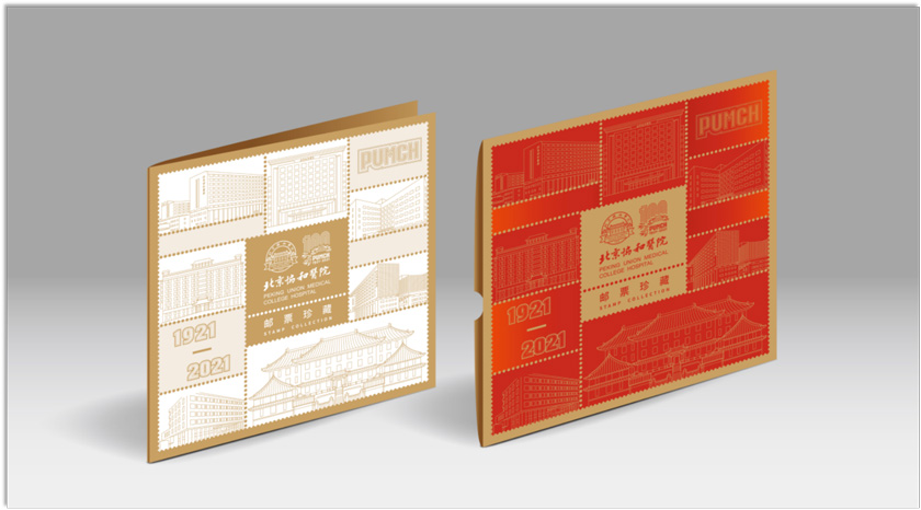 邮折整体设计围绕着百年院庆的设计主题,封面选取北京协和医院的典型建筑、PUMCH、1921-2021等设计元素进行矢量插图绘制、以邮票切割齿孔为灵感,将画面重构组合,通过现代感的设计风格展现北京协和医院的百年历程,契合北京协和医院“百年协和 一切为民”的精神。