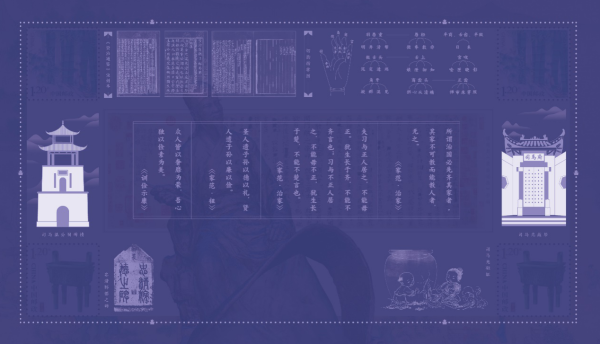 邮票边饰选用明代仇英所绘司马光故园——《独乐园图》。司马光曾在此潜心修史十数载,园中七景分别致敬其仰慕的七位贤德。