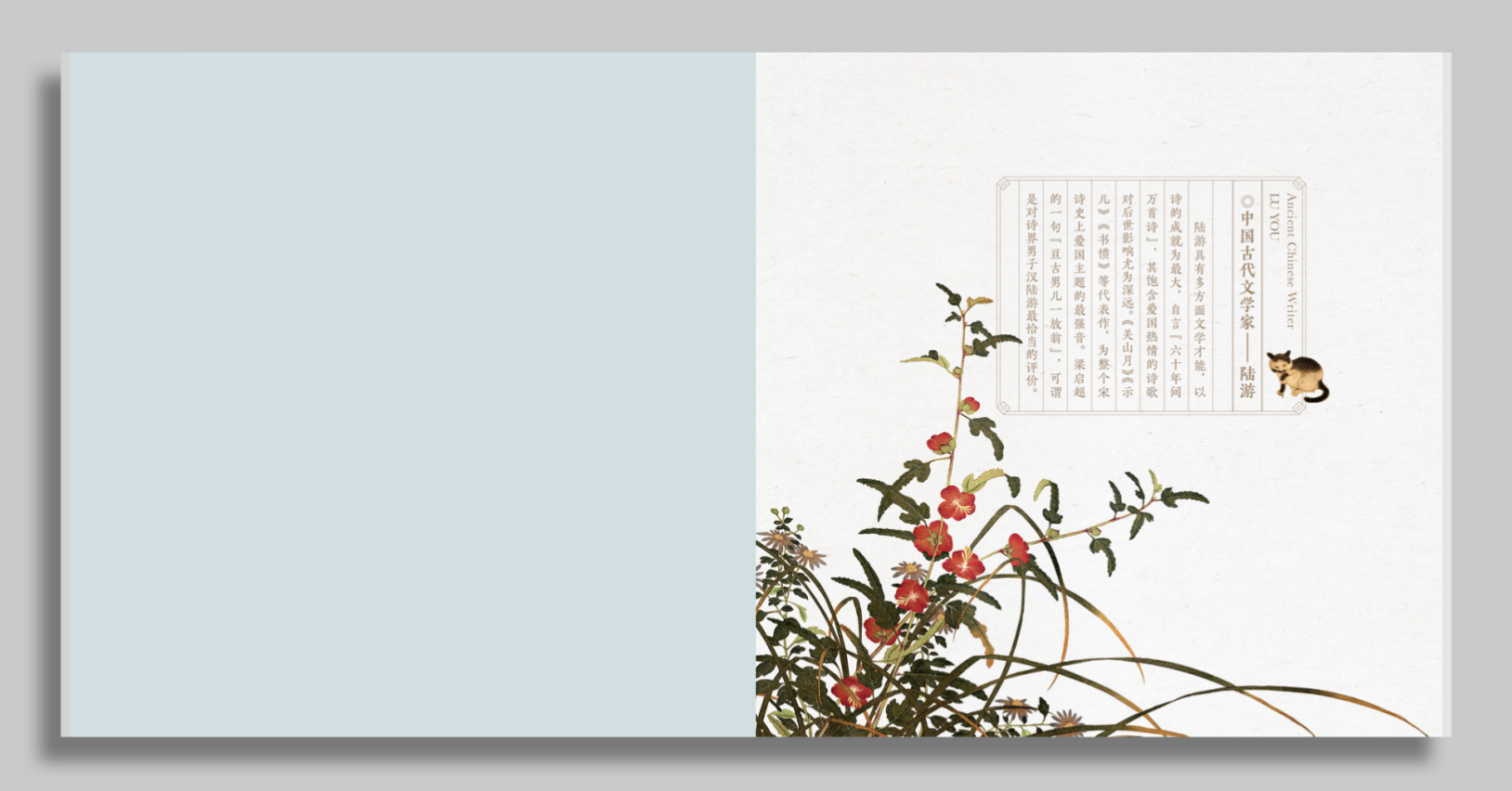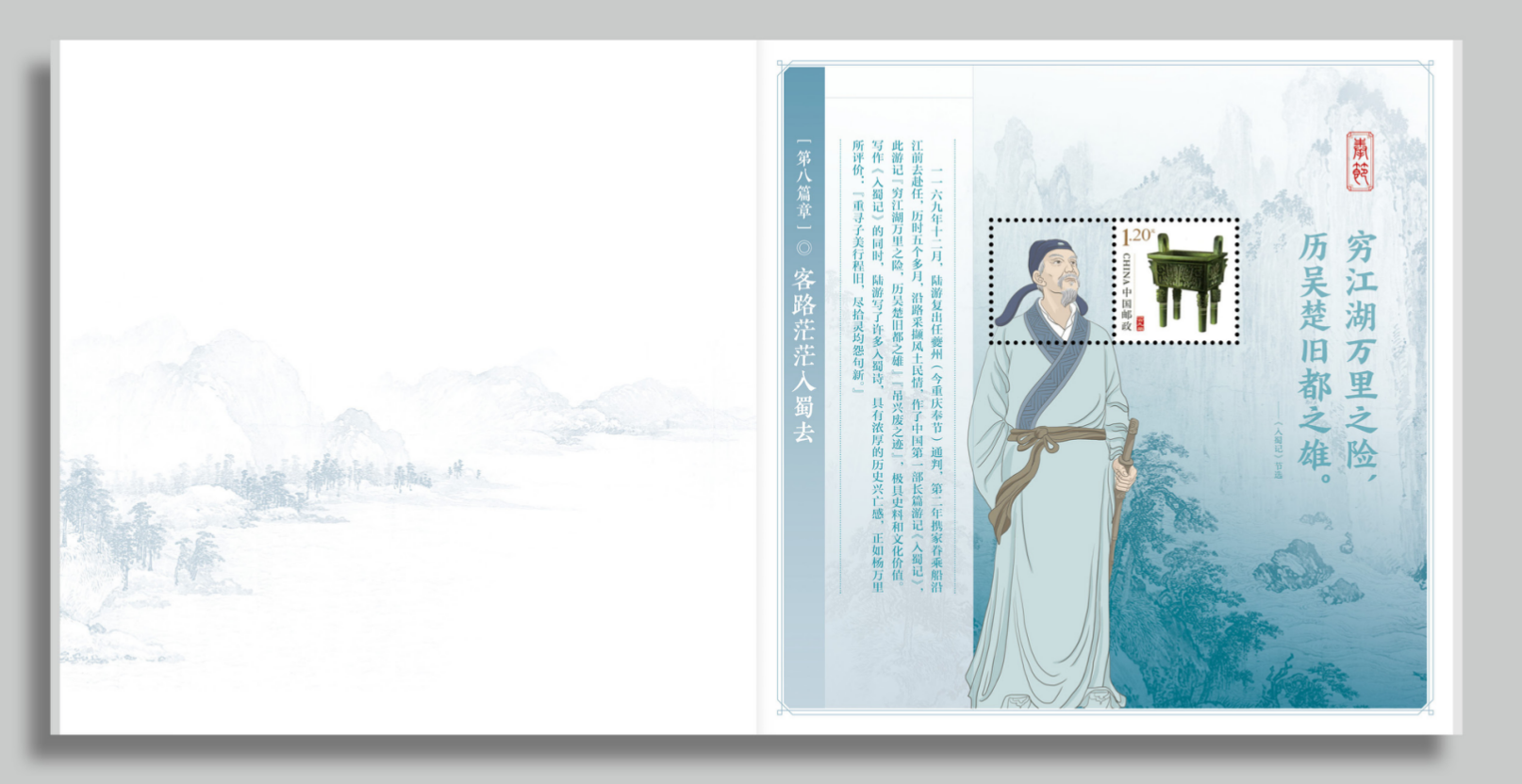 《中国古代文学家——陆游》个性化邮票本册设计力求简约文雅,体现陆游的诗词文化意境。人物形象选用目前最具代表性的陆游像进行再创作。陆游抱猫,是陆游的个人爱好,也是田园生活、国家命运的寄托。