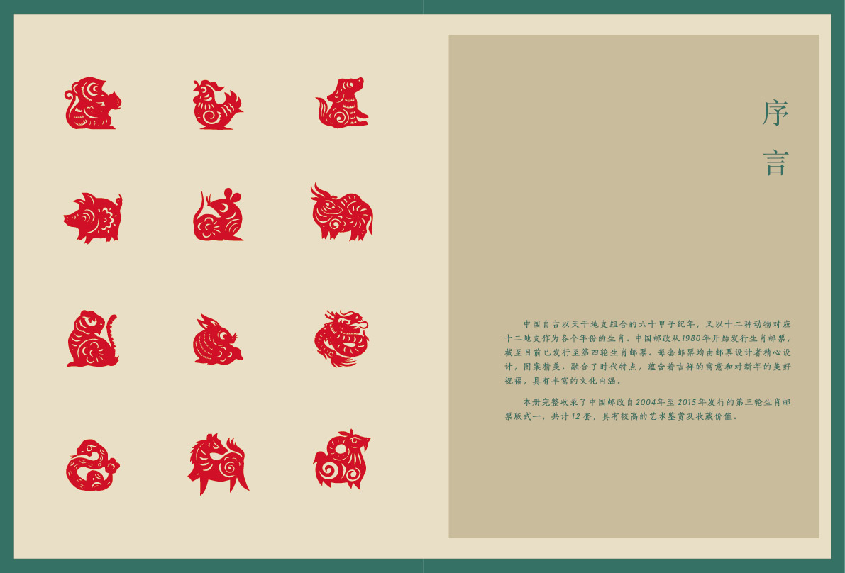 生肖文化源于中国,历史源远流长,每个中国人都有属于自己的生肖属相,出自邮票设计大师的生肖邮票一经发行,就深得集邮爱好者的喜爱,一直都是热门的邮票题材。本册完整收录了中国邮政自2004年至2015年发行的第三轮生肖邮票版式一,共计12套,每套邮票设计精美,较前两轮生肖邮票在风格上更加统一,每套邮票既有自己独特的艺术特色,又不影响第三轮生肖邮票的整体统一艺术效果,具有较高的艺术鉴赏及收藏价值。
