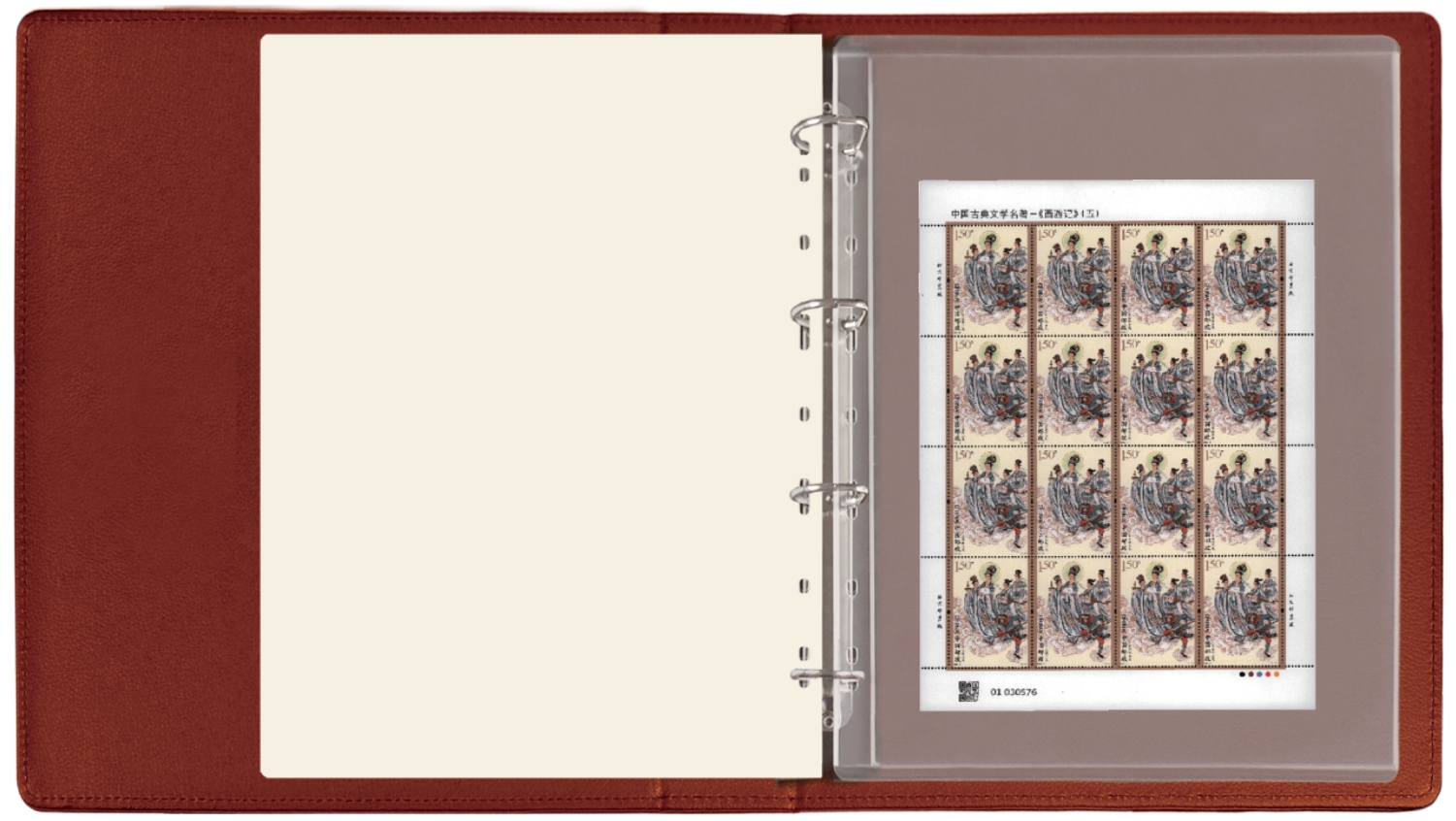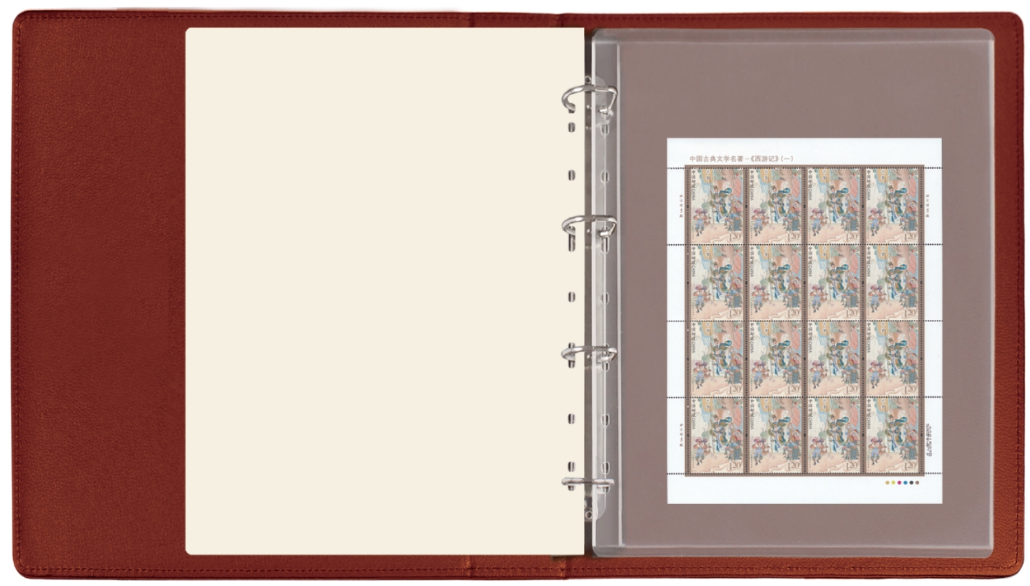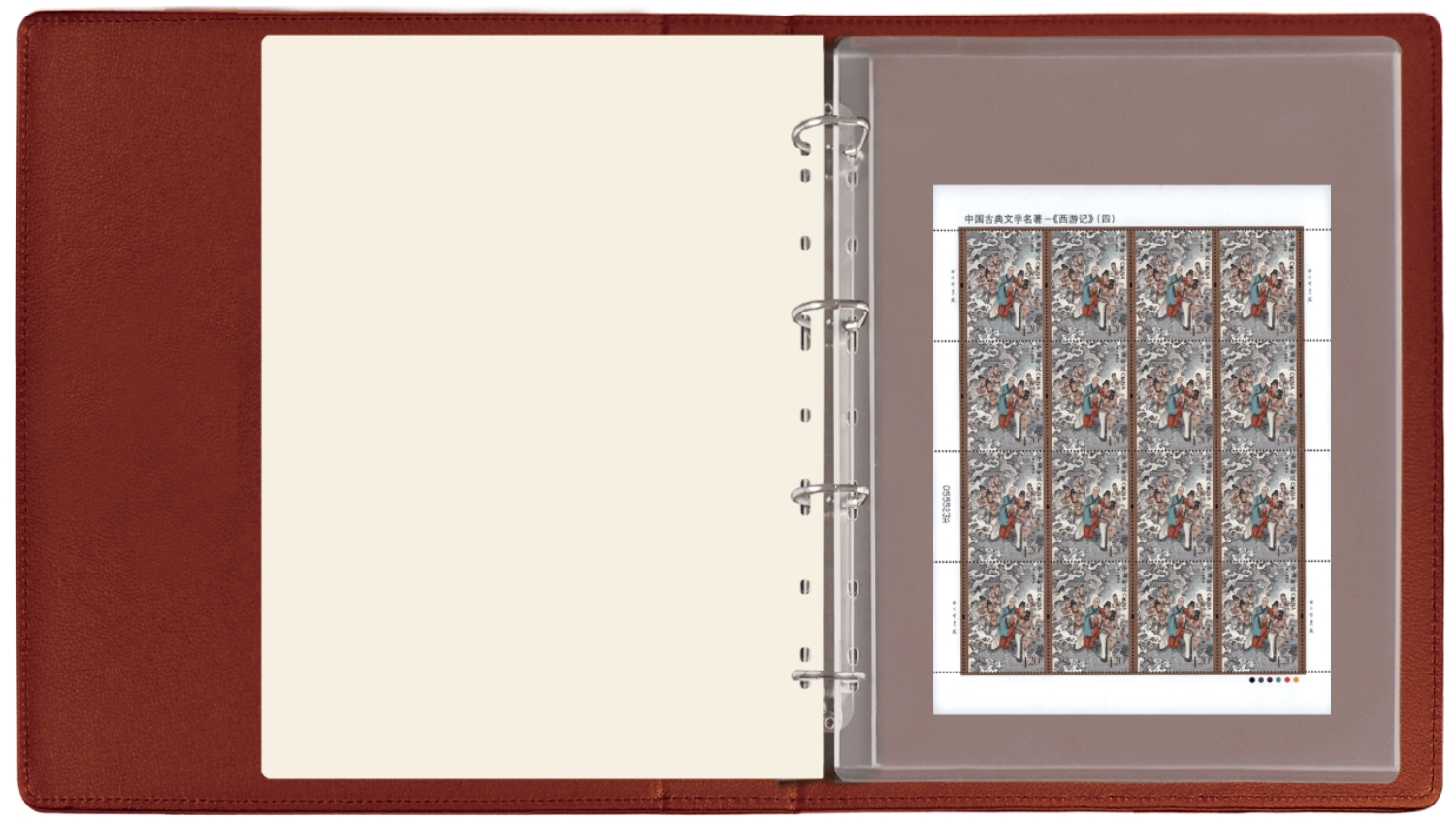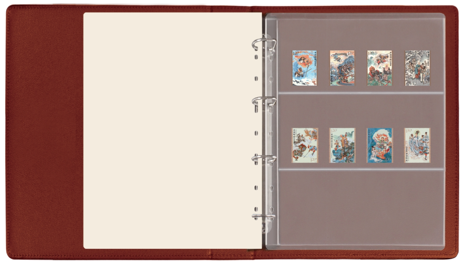 产品内含中国邮政自2015年至2023年发行的《中国古典文学名著——<西游记>》一至五组邮票套票、四方连、小型张、版式一、版式二、四方连邮票折和全张邮票折,并使用精美活页册作为包装物,既便于观赏邮票,又对邮票起到很好的保护作用。
