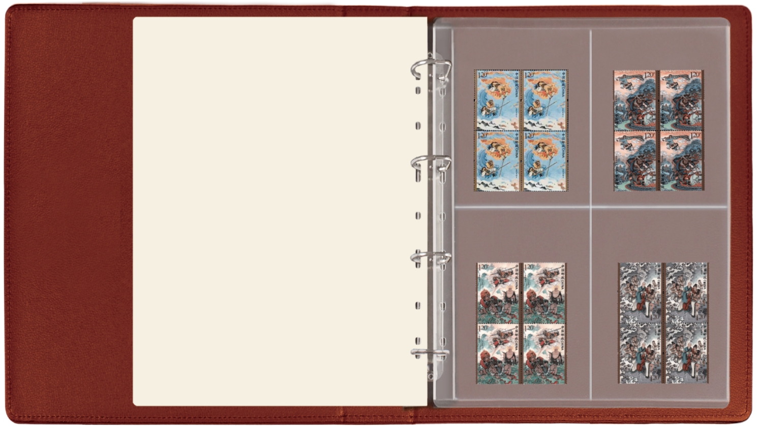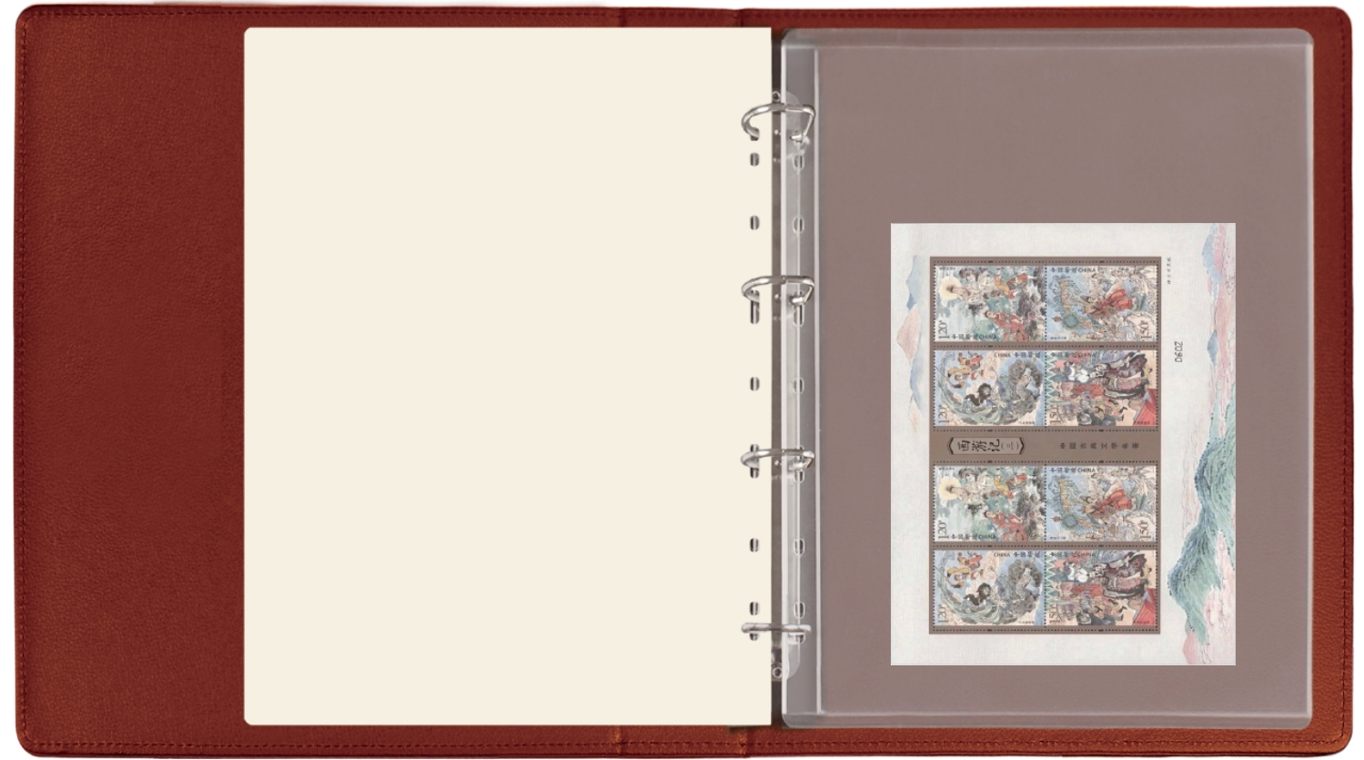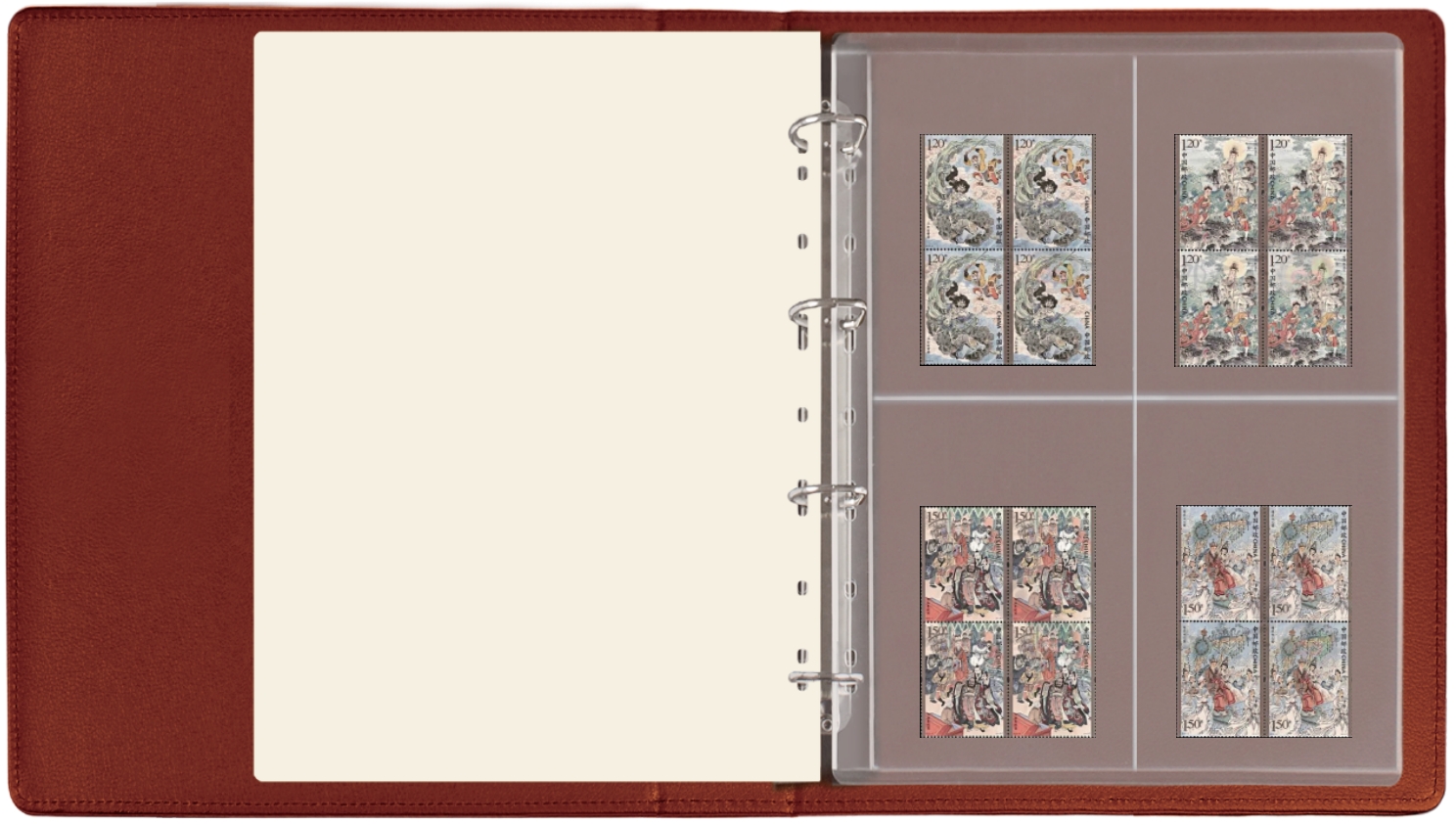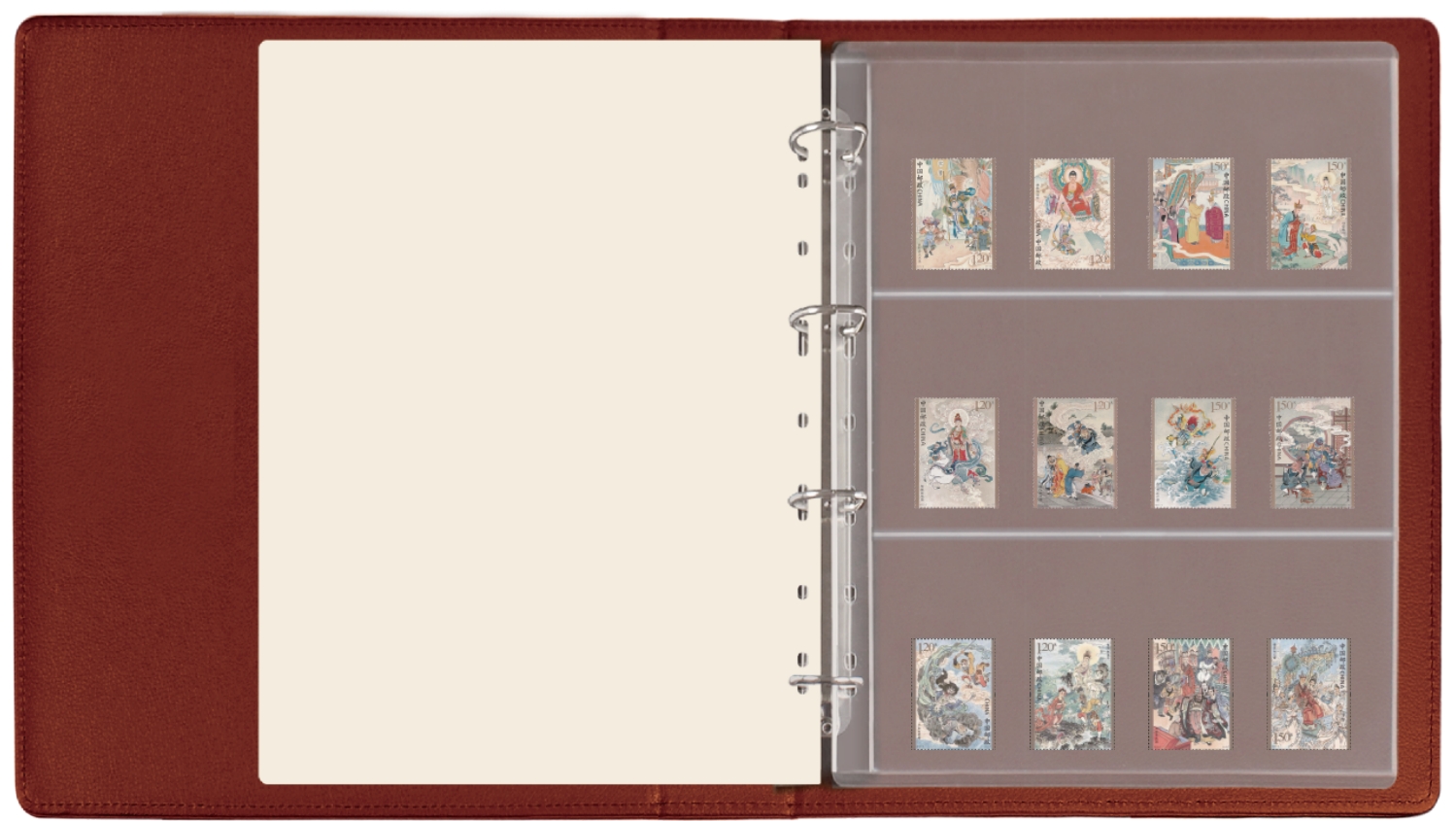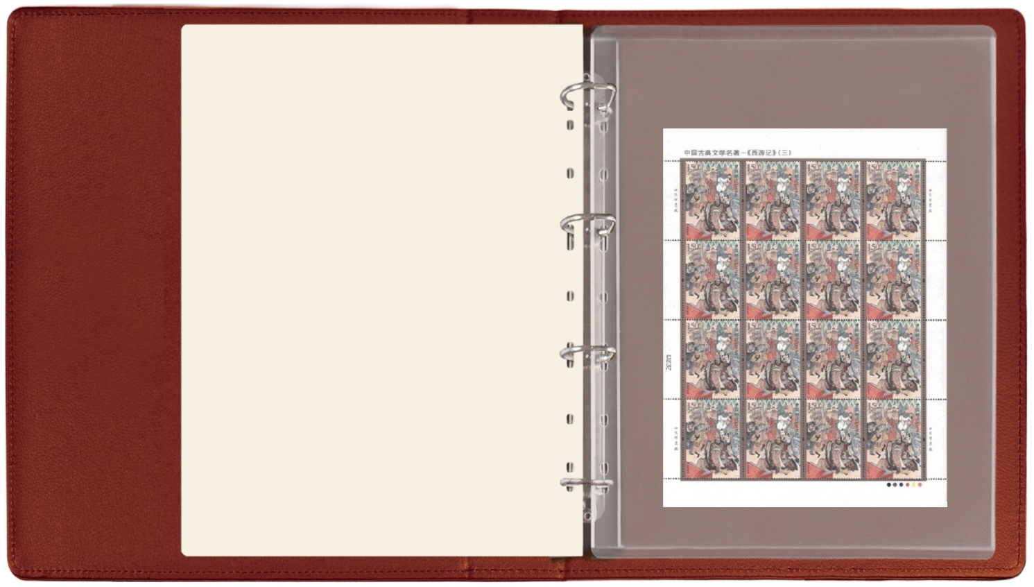 产品内含中国邮政自2015年至2023年发行的《中国古典文学名著——<西游记>》一至五组邮票套票、四方连、小型张、版式一、版式二、四方连邮票折和全张邮票折,并使用精美活页册作为包装物,既便于观赏邮票,又对邮票起到很好的保护作用。