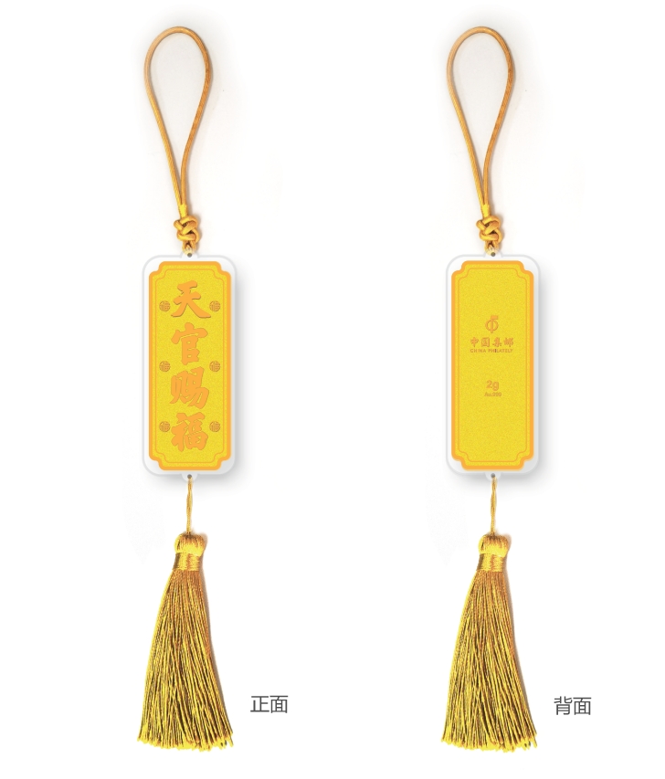 产品内含纯金图卡吊坠一枚,图卡正面写着“天官赐福”四个大字,整张图卡装入带挂绳和流苏的亚克力盒中,既有美好的寓意又非常实用。