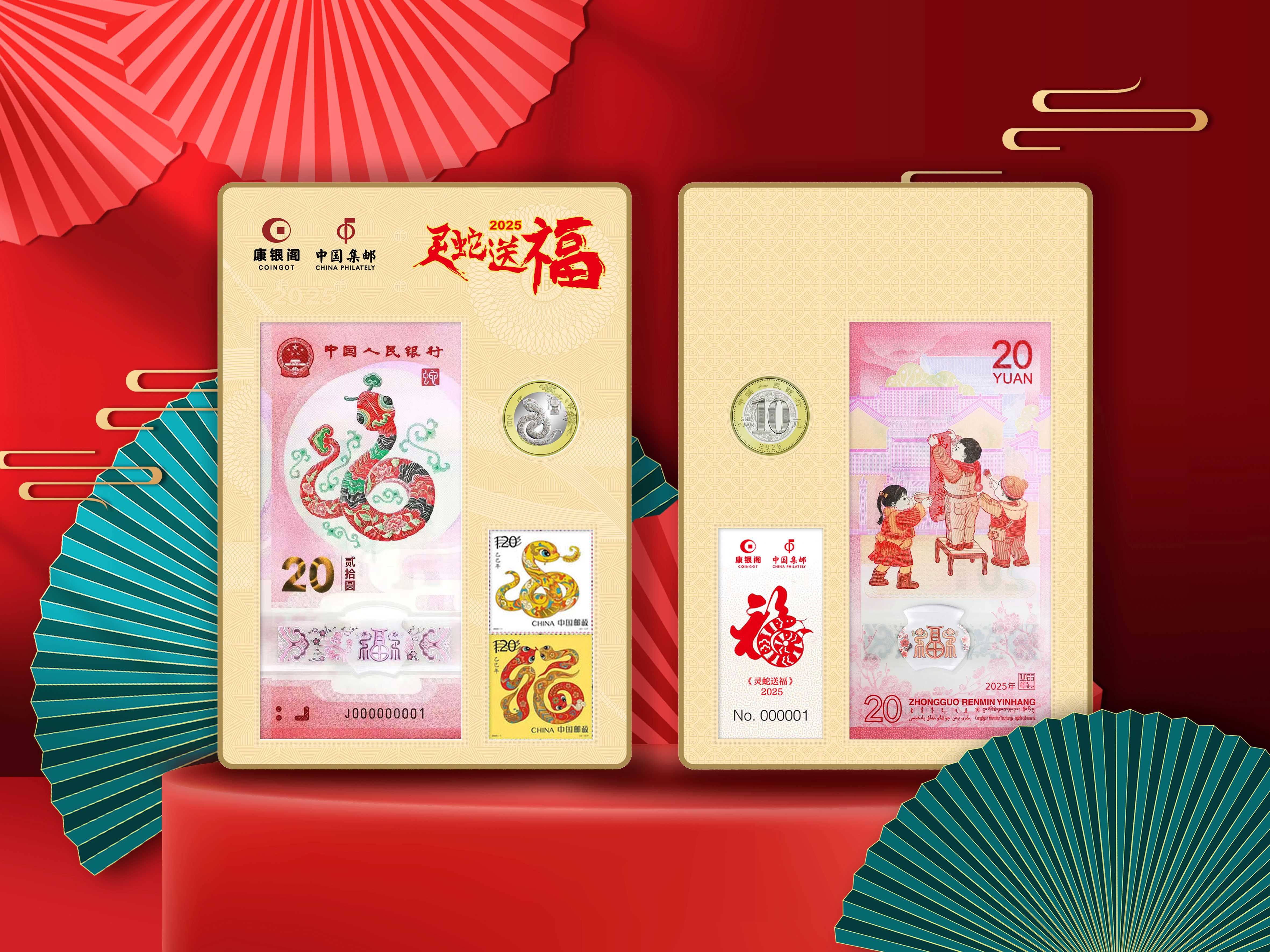 产品由2025年贺岁纪念钞、2025年贺岁普通纪念币及防伪标签组成,中国集邮、康银阁双品牌联名产品。