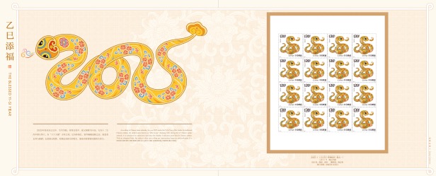 中国集邮有限公司于2025年1月17日发行《乙巳添福》中国邮政与联合国邮政、列支敦士登邮政蛇年生肖邮票珍藏邮折,内放《乙巳年》版式一、联合国邮政《中国农历蛇年》整版、列支敦士登蛇年邮票小版张、《乙巳添福》个性化邮票。