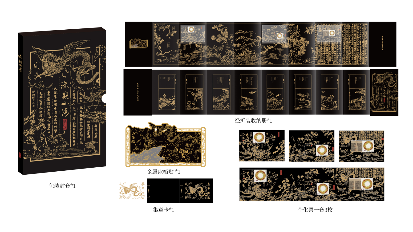 个性化邮票和风琴折,均采用黑金专色印制,古风典雅,底蕴深厚。