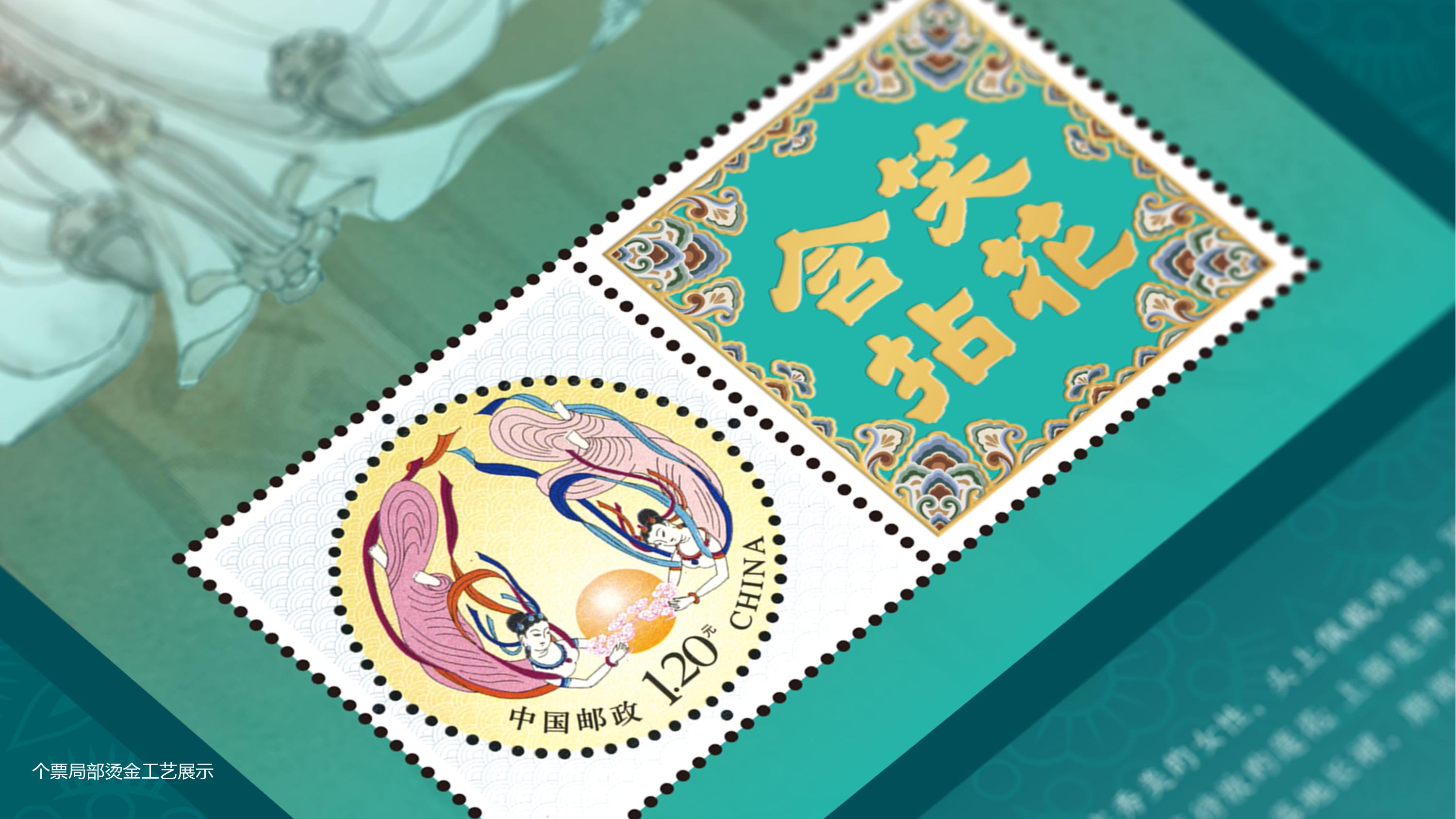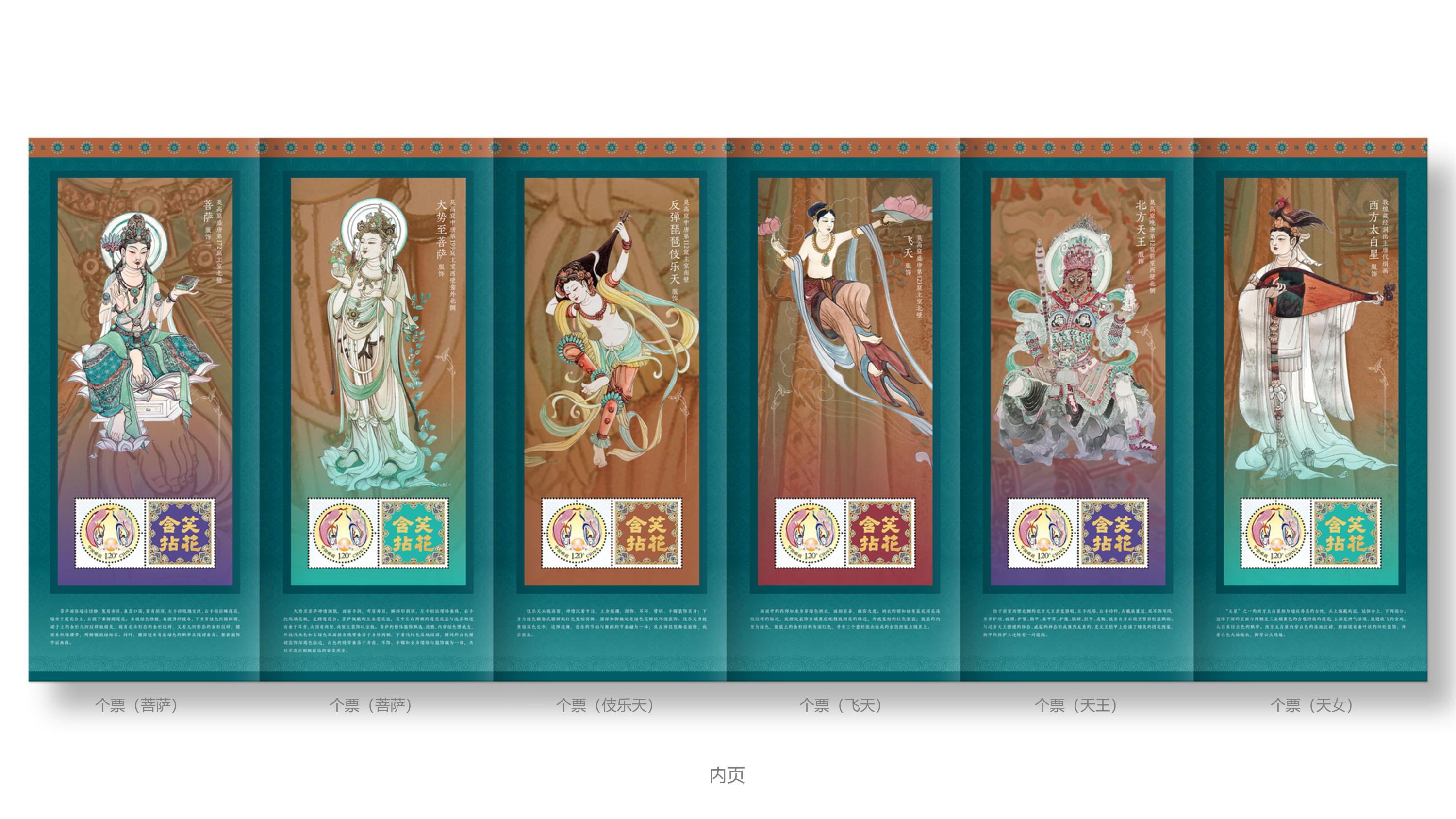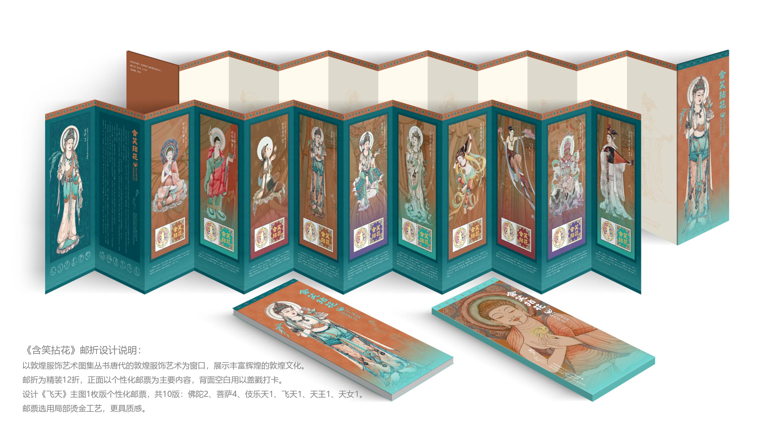 《飞天》主图契合敦煌主题,一枚版90mm*120mm大面幅特殊版式突破传统邮票方寸限制,凸显服饰精美绝伦,提供更好欣赏体验。邮票“含笑拈花”字样及取材于敦煌壁画的团花图案,均采用烫金工艺。