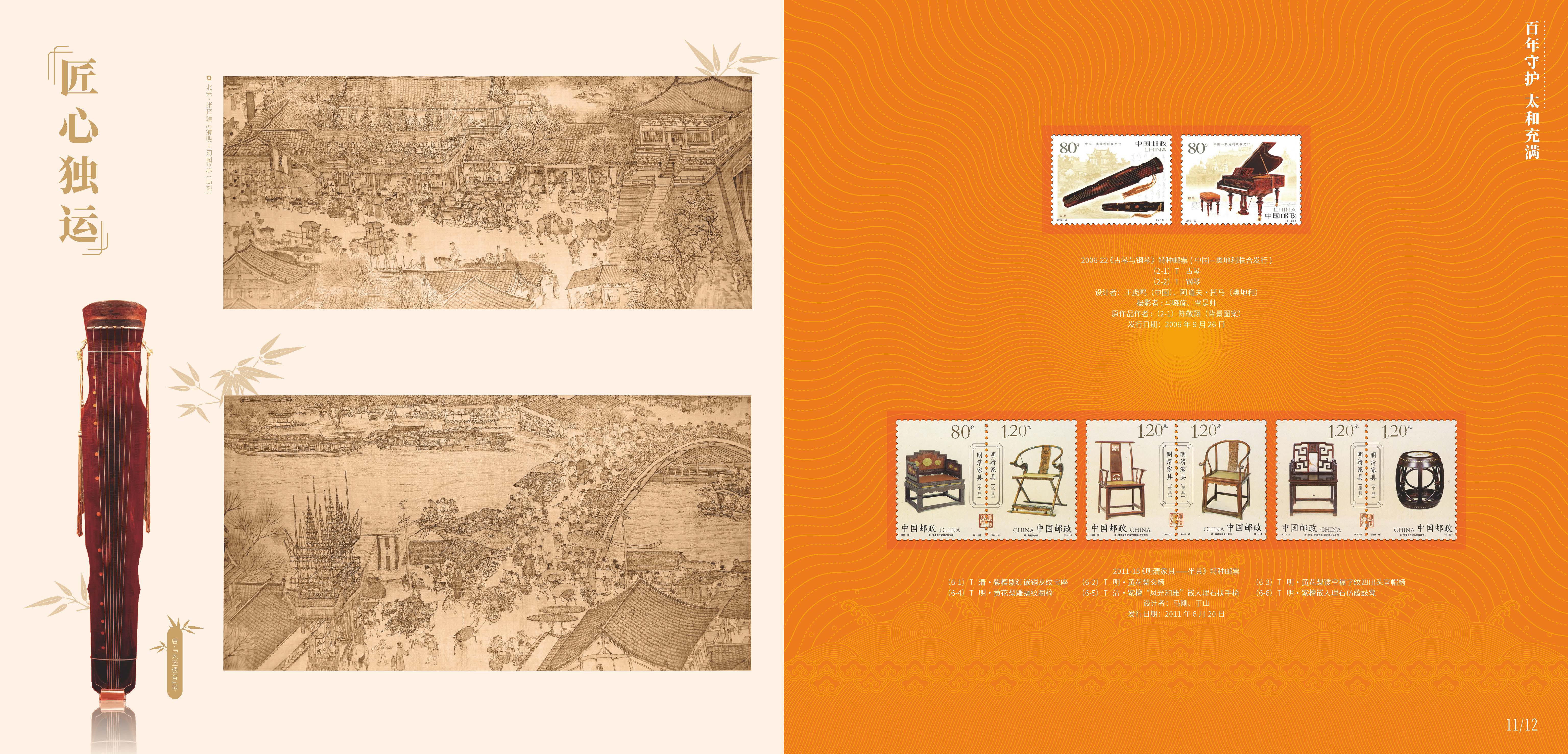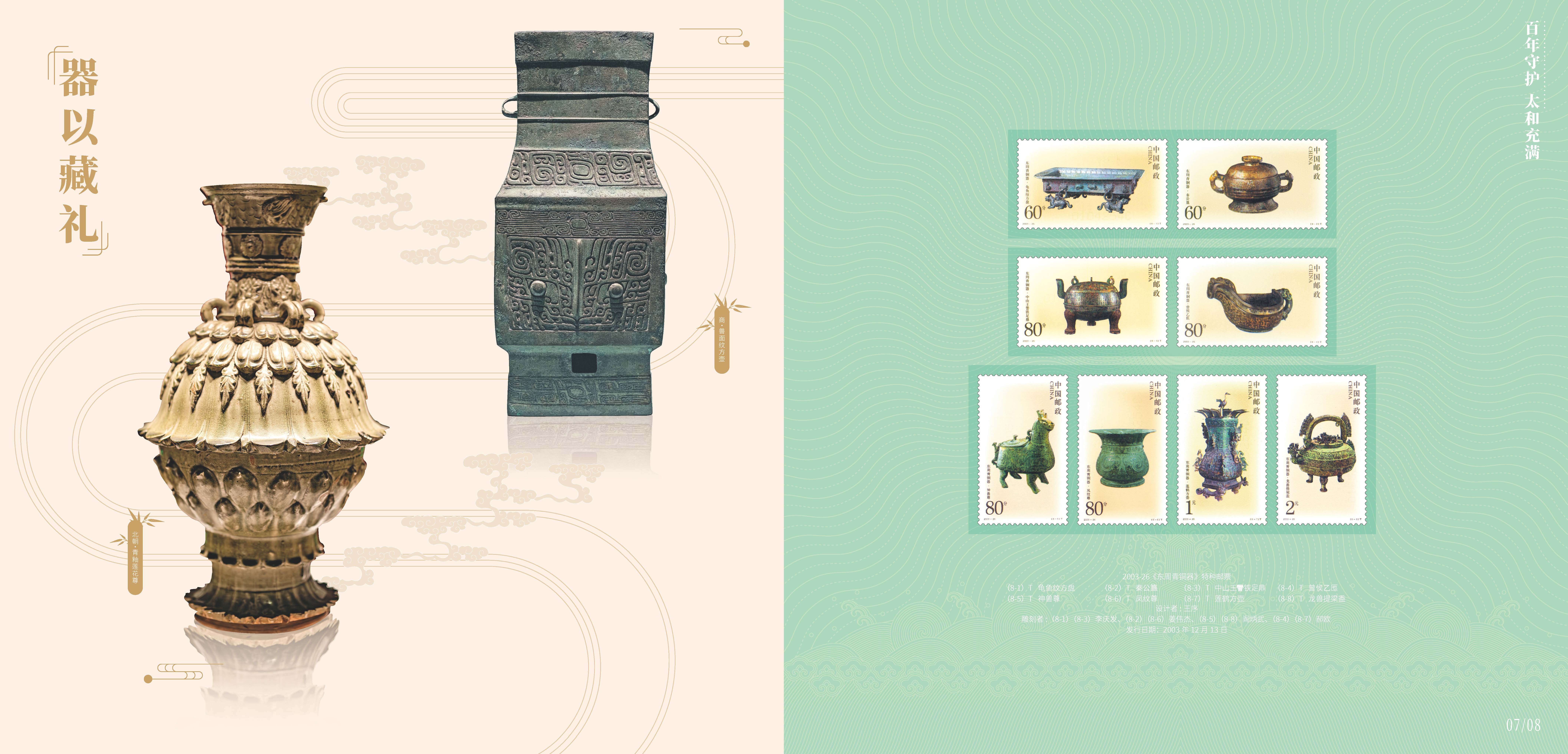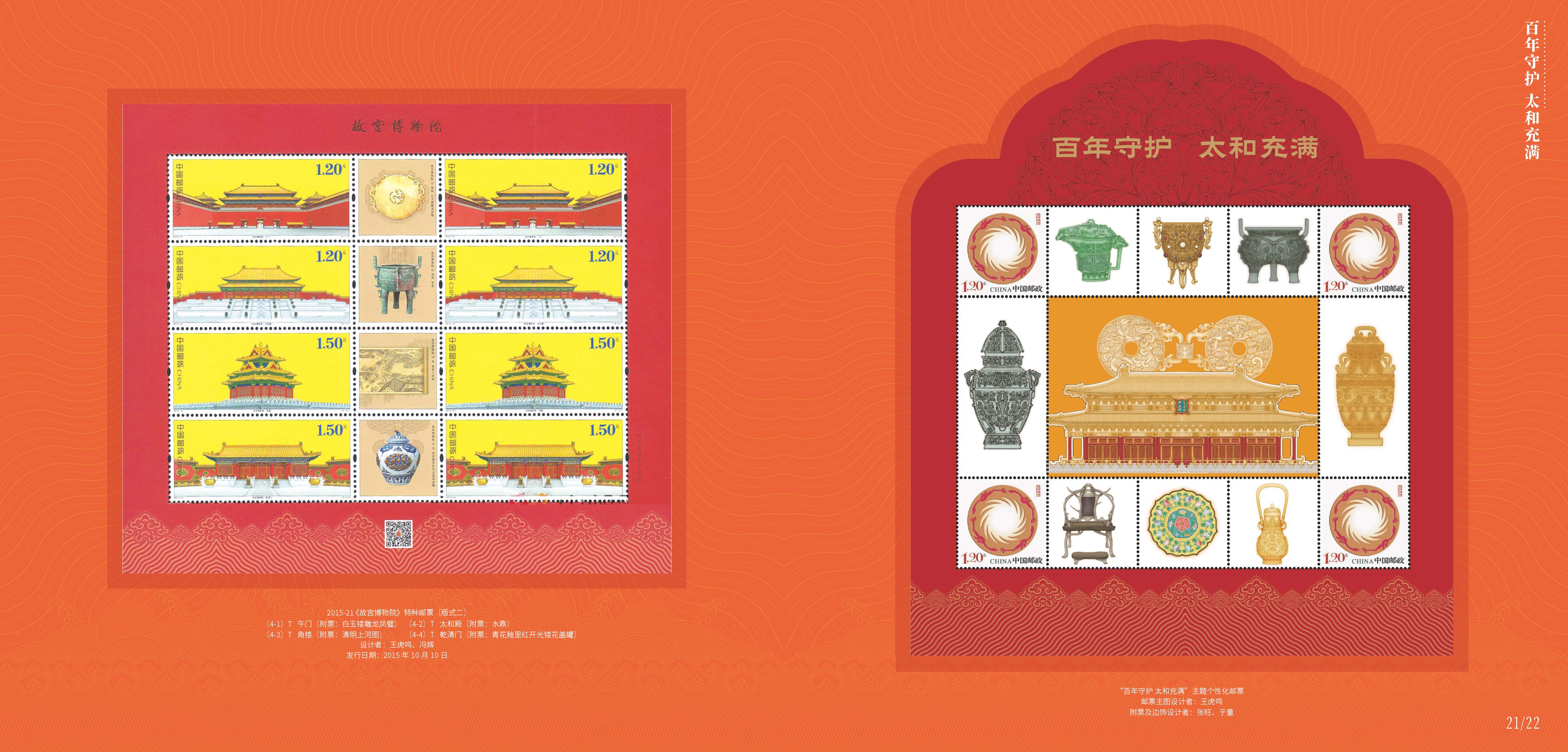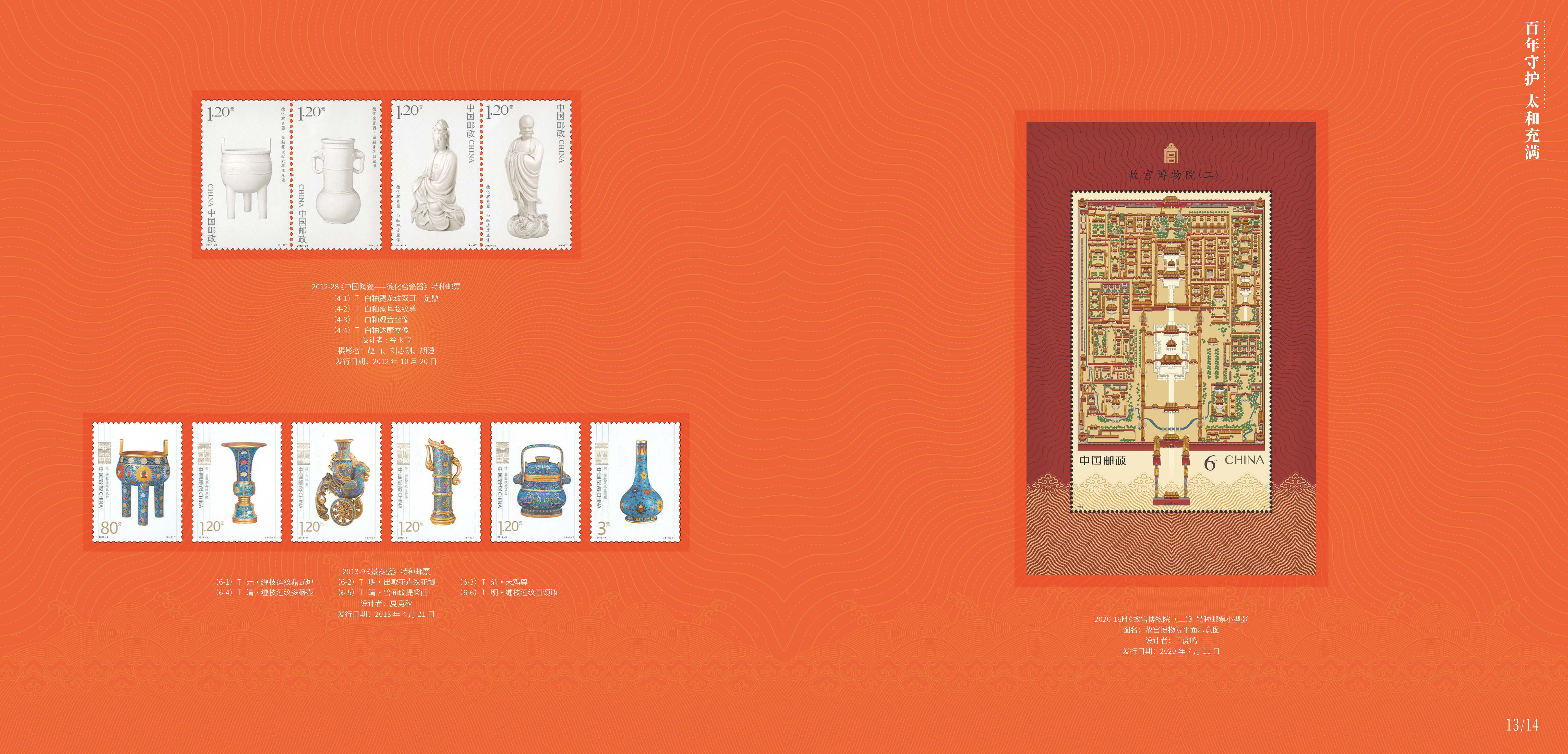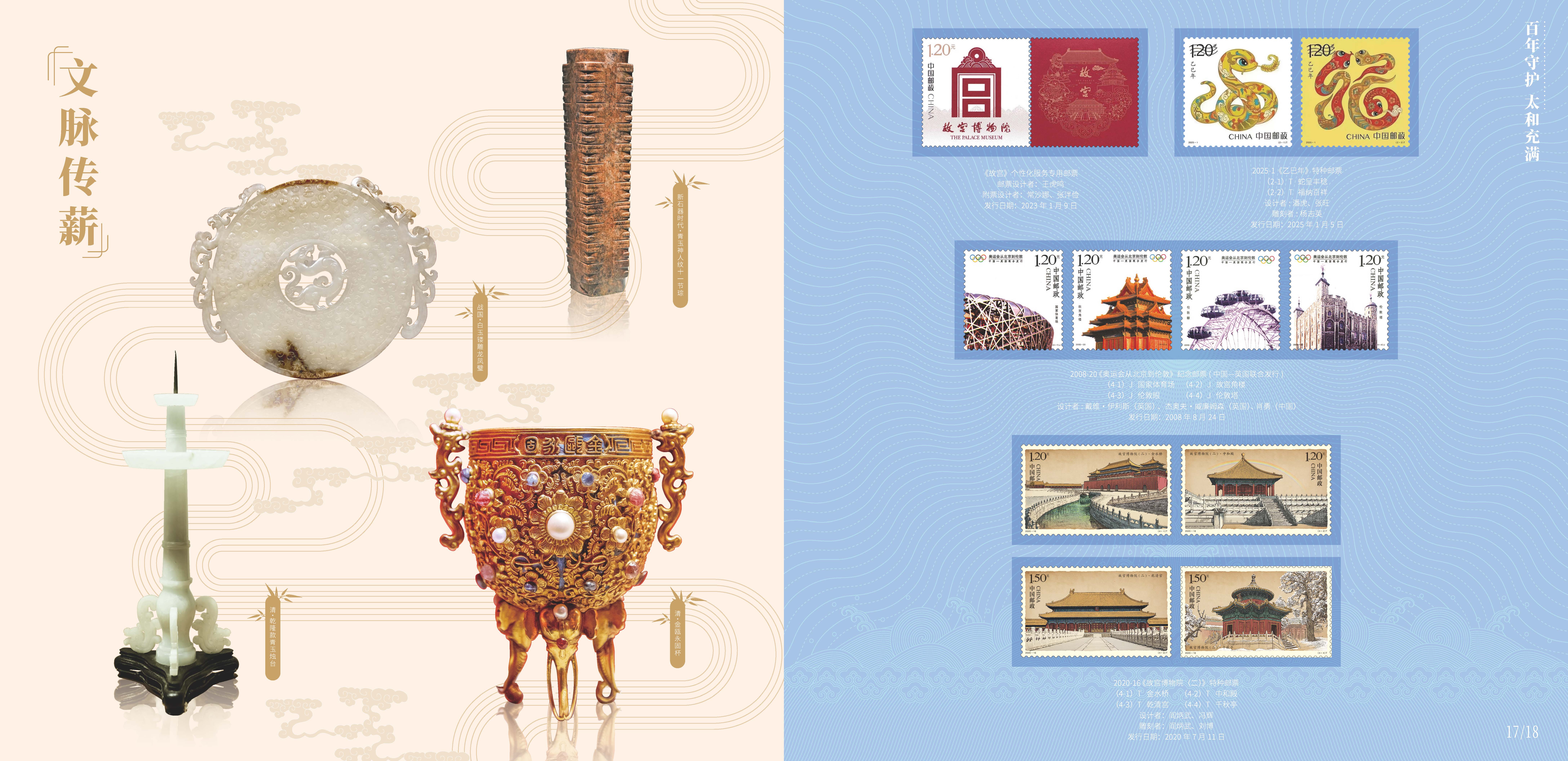 2017-3《千里江山图》套票、2003-26《东周青铜器》套票、2012-21《和田玉》小全张、J.120《故宫博物院建院六十周年》套票、2016-13《文化遗产日》套票、《故宫》个性化服务专用邮票原版票套票、2020-16《故宫博物院(二)》套票、2020-16M《故宫博物院(二)》小型张、2025-10《中国古代书法——篆书(二)》套票、2012-28《中国陶瓷——德化窑瓷器》套票、2021-4《五牛图》套票、2015-21《故宫博物院》套票、2015-21《故宫博物院》版式二、2006-22《古琴与钢琴(中国和奥地利联合发行)》套票、2011-15《明清家具——坐具》套票、2013-9《景泰蓝》套票、2013-14《金铜佛造像》套票、2008-20《奥运会从北京到伦敦(中国和英国联合发行)》套票、2019-16M《五岳图》小全张、2025-1《乙巳年》套票、“百年守护 太和充满”主图个性化邮票、邮册