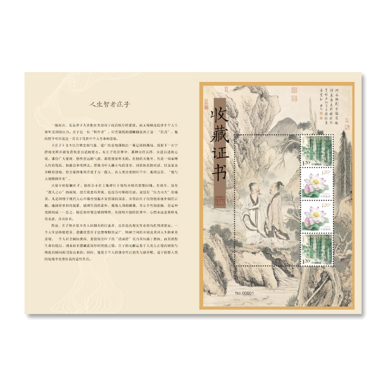 产品设计运用中式山水等相关元素,表现庄子“逍遥齐物”的意境,内页色调淡雅,充满古意。邮折右页放《庄子》个性化邮票收藏证书,收藏证书采用《竹》与《荷花》双主图,附图选取《濠梁图》,画面中庄子与惠子,临池观鱼,格调高雅、古意盎然。