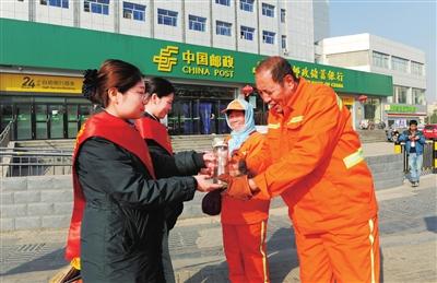 夏有凉茶、冬有热水,太原市邮政分公司始终如一关怀户外作业者。进入冬季,太原市分公司各网点在营业厅堂准备了热水和纸杯,还走出厅堂,为户外工作者送上冬日的温暖。图为太原市迎泽区车站邮政支局工作人员为环卫工人送上热水。
