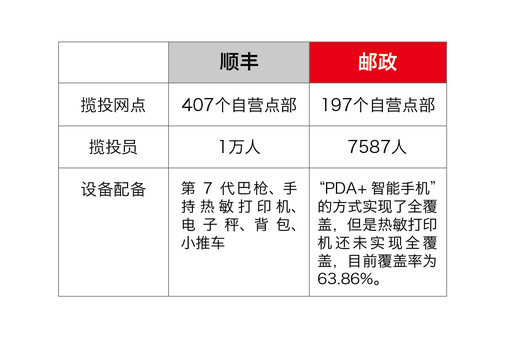 不只在网运方面,邮政在揽收、投递等环节上与竞争对手也存在差距。从揽收能力上来说,以河北为例,顺丰有揽投网点407个,邮政寄递事业部有269个;顺丰有一线揽投员1万人,寄递事业部有7587人。在设备配备方面,顺丰配有第7代巴枪、手持热敏打印机、电子秤、背包、小推车;河北邮政通过“PDA+智能手机”的方式实现了全覆盖,但是热敏打印机还未实现全覆盖,目前覆盖率为63.86%。(见图表2)