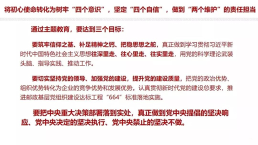 开展这次主题教育,就是要坚持思想建党、理论强党,坚持学思用贯通、知信行统一,推动广大党员干部不断增强“四个意识”、坚定“四个自信”,坚决做到“两个维护”,最关键的是坚决维护习近平总书记党中央的核心、全党的核心地位,做到“三个体现在”:体现在与党中央保持高度一致上,体现在严守党的政治纪律和政治规矩上,体现在坚决贯彻落实党中央重大决策部署上。