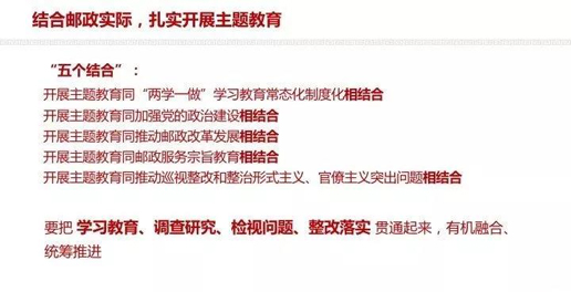 刘爱力提出,开展主题教育要做到“五个结合”:开展主题教育同“两学一做”学习教育常态化制度化相结合,同加强党的政治建设相结合,同推动邮政改革发展相结合,同邮政服务宗旨教育相结合,同推动巡视整改和整治形式主义、官僚主义突出问题相结合。他深入阐述了如何将学习教育、调查研究、检视问题、整改落实贯通起来,有机融合,统筹推进。