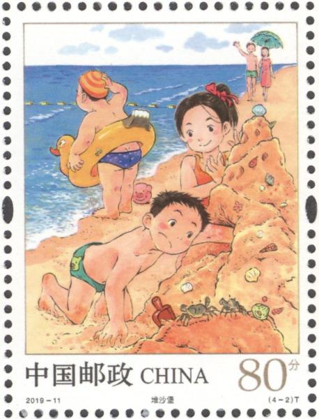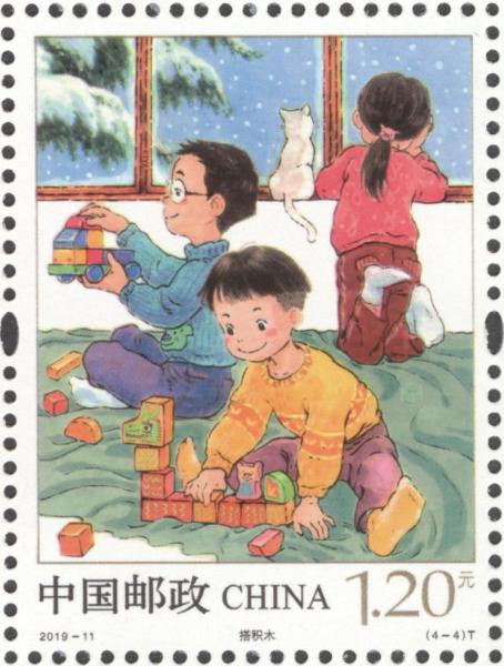 本套邮票描绘了拼拼图、堆沙堡、滑轮滑、搭积木四种广受现代儿童喜爱的游戏,两种益智类、两种体育类,其中第一图的拼长城内容呼应了庆祝新中国成立70周年的概念。