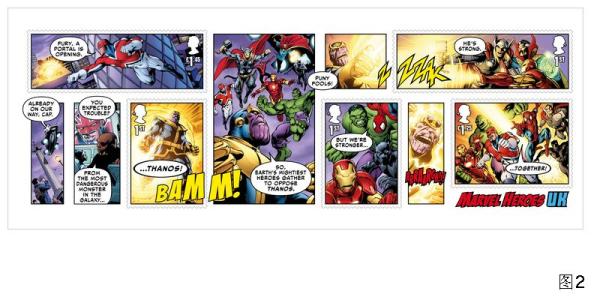 同时面世的内含5枚邮票的小全张内容为专门为本次邮票发行而创作的小短篇《英国复仇者联盟》(图2)。