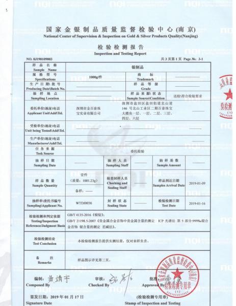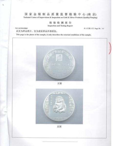 国家金银制品检验中心报告(传世收藏金猴大银章)