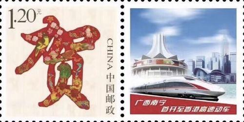 7月10日起,广西南宁和香港特别行政区之间每天开行1对始发高速动车组列车。为此,南宁市邮政分公司特申请制作个性化邮票一套,发行纪念封一枚,启用纪念邮戳一枚。个性化邮票采用"贺"为主图,寓意庆贺两地首开直达高速动车,附票为复兴号列车、南宁城市地标——国际会展中心、香港维多利亚港畔建筑群等。