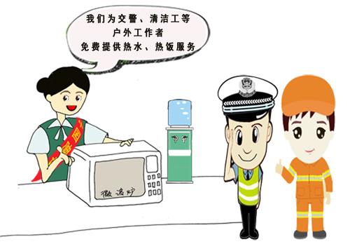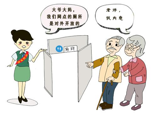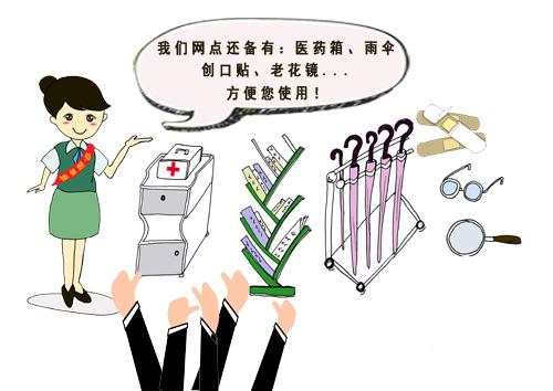 想测血压,可在网点内免费量血压。 出门内急,网点对外开放厕所。 陪老人办理业务,可享受爱心座椅。 网点还备有:医药服务箱、雨伞、充电宝、老花镜 户外工作者可进网点休息、接热水、热饭。