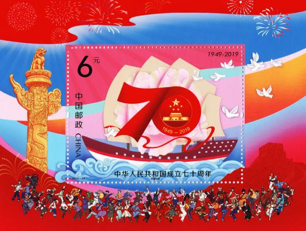 中国邮政定于2019年10月1日发行《中华人民共和国成立七十周年》纪念邮票1套5枚,小型张1枚。邮票图案名称分别为:经济持续健康发展、社会主义民主政治推进、文化繁荣兴盛、人民生活不断改善、建设美丽中国,小型张图案名称为:祝福祖国。全套邮票面值为12元。
