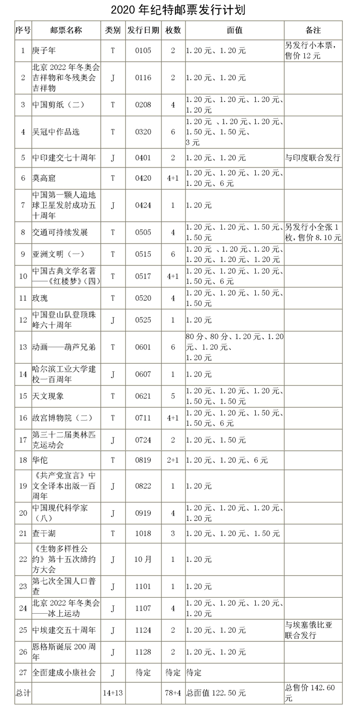 2019年11月4日,经国家邮政局审定,2020年纪特邮票发行计划27套,包括纪念邮票14套,特种邮票13套。选题涉及经济、政治、文化、社会、生态文明以及外交、体育等多个方面,较为全面反映国家生活各方面的成就与面貌。