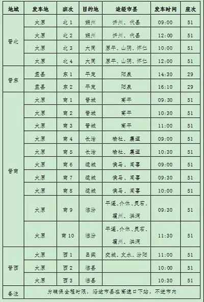 务工返乡(散客线):以太原市为中心,按东西南北4个方向,从太原西客站发车,大同、朔州、吕梁、晋城、长治、运城、临汾等各市均有专车发送。