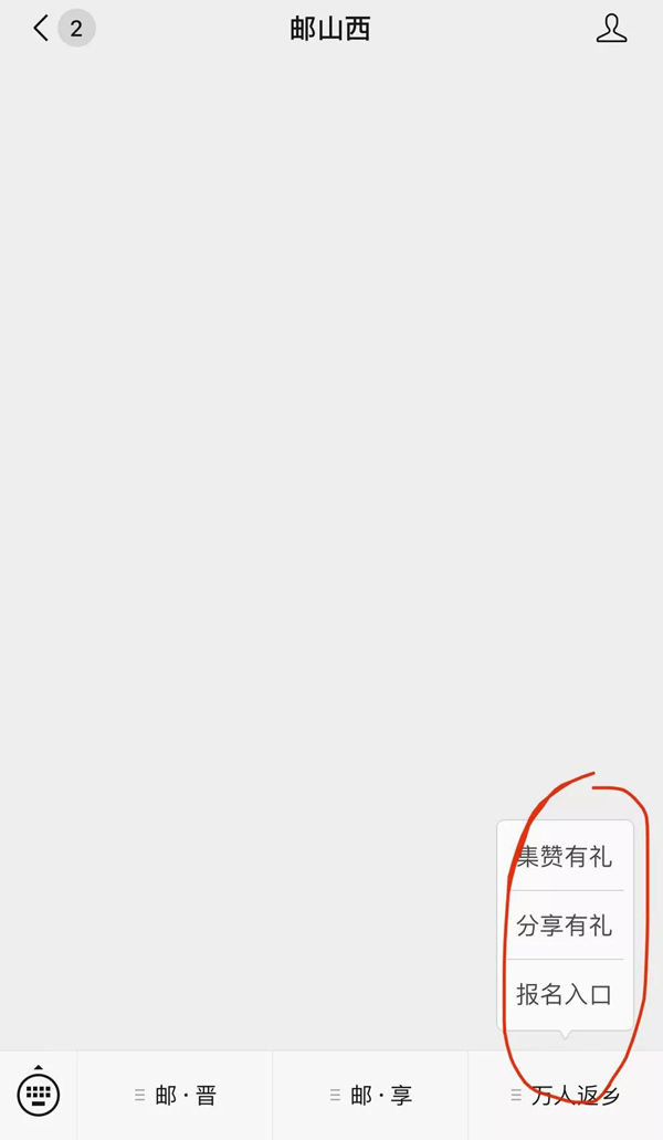 1、关注“邮山西”微信公众号,进入万人返乡专区参与分享得红包活动。