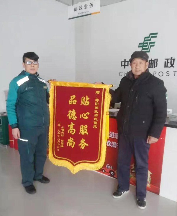 12月15日,运城永济市韩阳邮政营业所外人头攒动,噼里啪啦的鞭炮声震耳欲聋,两名客户把“贴心服务 品德高尚”的锦旗递到了营业兼投递员(劳务承揽)武俊民的手中……