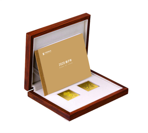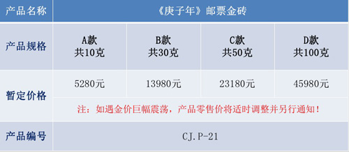 《庚子年》邮票金砖是继2010年虎年生肖邮票金砖发行后,推出的第十一组生肖邮票金砖。产品使用 Au99.99原料制作,单色原大仿印2020-1《庚子年》邮票图案(一套两枚),制作A款10克、B款30克、C款50克、D款100克纯金制品。除A款产品外,B、C、D各款产品均配有木盒、纸盒、手提袋等包装。A款产品配中国集邮总公司发行的《庚子年》生肖文化专题邮册,内含《庚子年》邮票套票、版式一、版式二、小本票、首日封等。