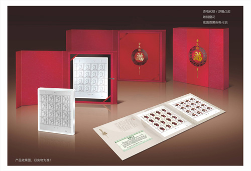 该产品设计以“金鼠纳福”主题展开,主元素以“鼠”与“福”字的巧妙结合,辅元素以窗花镂空设计、底部垫张有对比色色卡增加视觉立体感。