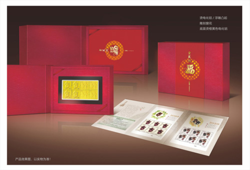 产品内容:一对贺岁金(共0.2克)、一套两版《庚子年》邮票版式一、一枚《庚子年》邮票小本票