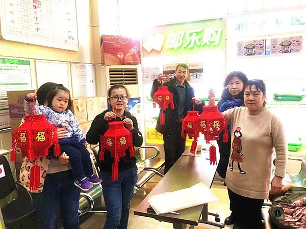 太原市双塔路邮政支局邀请客户一起制作象征着团圆喜庆的红灯笼,在制作过程中,支局经理还和大家分享了制作灯笼的历史和各地灯笼的特色。
