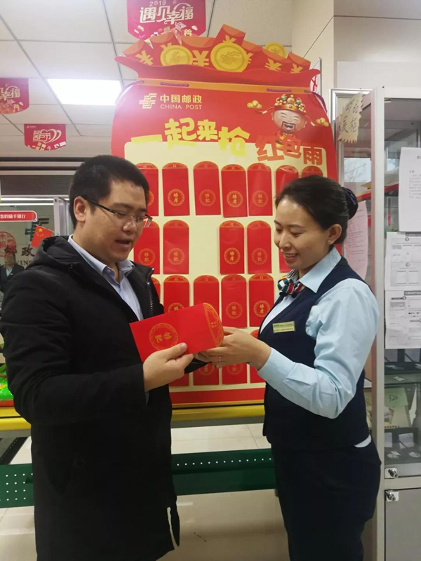 朔州市平朔路邮政营业所邀请办理业务的客户参与“迎新年、接红包”活动。