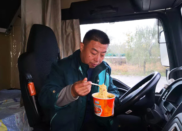 邮运驾驶员为节省时间,在服务区以方便面充饥。
