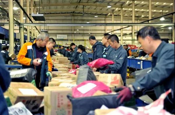 邮件处理作业现场,分拣员们正紧张有序处理发往全国各地的邮件。