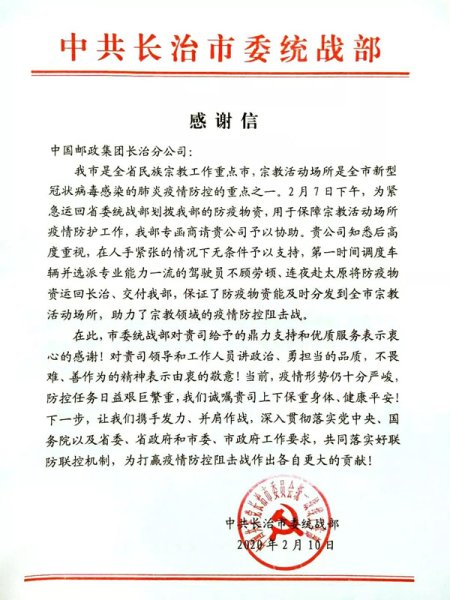 2月10日下午,长治邮政收到了一封来自市委统战部的感谢信。在信中,长治市委统战部对长治邮政给予的支持和优质服务表示感谢,并高度赞扬了邮政做为央企讲政治、勇担当、不畏难、 善作为的精神。