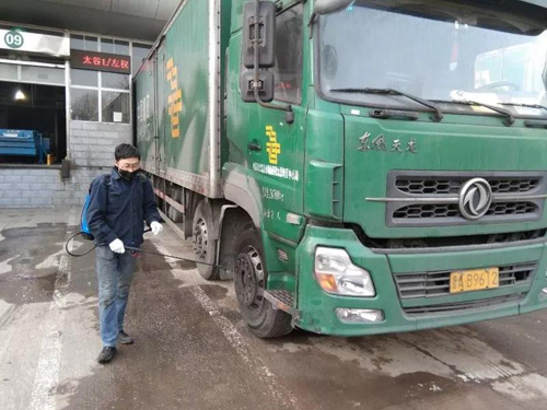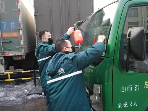 为邮车擦拭消毒中