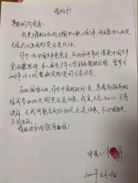 今年39岁的杨洋是一名共产党员,退伍后成为了太原邮区中心局的邮运驾驶员。杨洋每天也关注着疫情动态。当他从运输中心的群里看到有爱心企业捐赠物资后,第一时间手写了请战书。“我是一名中国共产党党员,有着19年大型车辆驾驶经验,我愿冲锋在抗击疫情的最前线,不计报酬,不论生死,坚决完成任务……”杨洋在请战书上郑重地签名,并摁上了鲜红的手印。