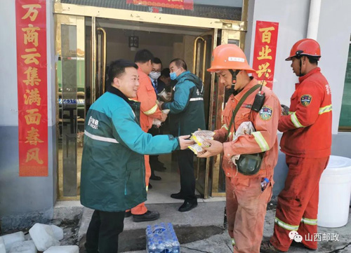 日前,山火已经被扑灭,为防止死灰复燃,仍有大批消防队员在火场值守。3月23日,五台山支局负责人李炎虹和赵玉生、高伟等员工,带着矿泉水、方便面和面包等慰问品来到防火指挥部,给消防人员、值守干部送去邮政人的心意。