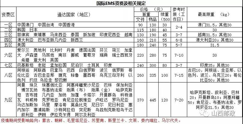 限重:国际EMS邮寄限重为30公斤,其中澳大利亚、哈萨克斯坦、叙利亚、阿根廷、以色列、波兰、乌克兰等国家限重20公斤。