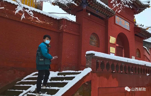 4月1日,我省迎来大范围降水,有“华北屋脊”之称的五台山上更是普降中到大雪,积雪最深处达15厘米,气温下降到-6℃。雪花飘过青山、遮住山路、笼住层林,此刻的台怀圣境银装素裹,红墙耀眼,呈现出一幅别样的佛国画卷。就在这红墙白雪间,还跃动着一抹鲜艳的邮政绿,那就是五台山邮政支局的投递员们。虽然天气恶劣,但丝毫没有阻拦投递员们正常出班,他们用自己的双脚履行着邮政普遍服务的庄严承诺,把报刊邮件及时送至各寺院和村落里。