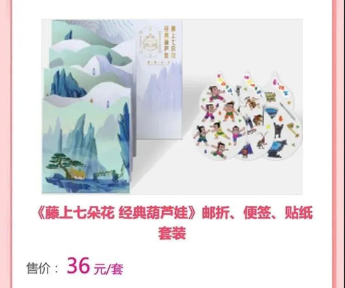 《藤上七朵花 经典葫芦娃》邮折、便签、贴纸套装。内含《动画一葫芦兄弟》特种套票一套。邮折展开是《葫芦兄弟》中经典异形模切的山峦场景,邮折背后的山峰空白处可自行DIY贴上附赠的《葫芦兄弟》的人物、妖精和法宝贴纸。邮折底部暗藏设计巧思,附赠葫芦形状便签纸一套,有趣又实用。