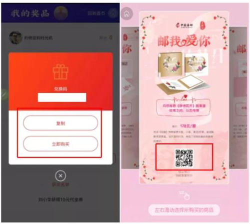 2.获得的代金券以优惠券码方式发放。可在活动页面“我的奖品”中奖列表中“复制”妥善保存,或可点击“立即购买”,选择本期指定活动商品邮票珍藏册商品海报后,扫码进入对应商品详情页,在订单支付前,依次选择:“礼品券-使用礼品券”,输入券码复制代金券码下单抵扣货款使用。