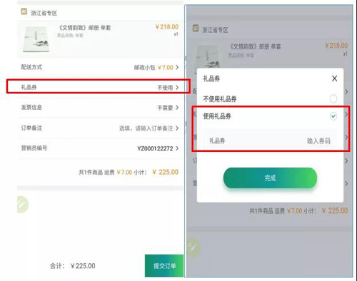 6、在提交订单前,进入礼品券-使用礼品券,输入活动获得的代金券码,即可支付抵扣相应金额。