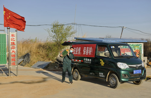 农民线上下单后,配送也是个大问题,广大一线投递员、党员和渠道平台业务后台人员挺身而出,成为农资最后一公里配送的主力军。平遥县分公司面对各村设卡严禁外人进入的局面,选派优秀投递员身穿防护服肩抗手提,将化肥送到村口或村民大田、果园中;五寨县分公司为给一个农户送肥,从县城出发,翻了三个山头,走了一个半小时车程才到达;安泽县分公司调动后台力量进行逐户配送,面对疾风暴雨、气温骤降,邮政人配送化肥的脚步没有停歇……