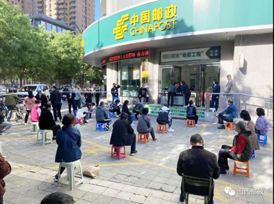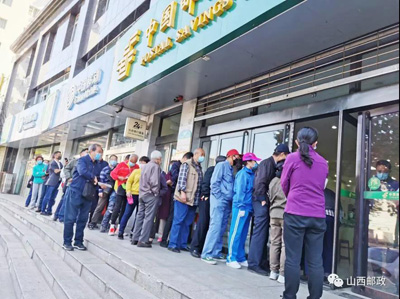▲运城市盐湖区邮政分公司大厦支局销售现场,客户间隔1米排队,等候购买。