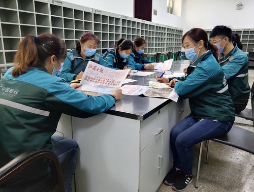连日来,太原市邮政分公司紧密结合实际,通过集中阅读党报的方式,学习了习近平在山西考察调研时的重要讲话。大家一致认为,要坚定不移地按照总书记重要讲话精神和党中央决策部署,全面贯彻党的十九大和十九届二中、三中、四中全会精神,坚持高质量转型发展,坚持“全心全意为人民服务”的宗旨,不忘初心,牢记使命,为中国邮政二次崛起努力奋斗。图为5月13日,广场投递部员工在夕会上集中学习。