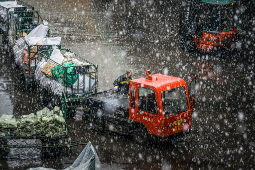 2月14日,北京市邮区中心局负责接发邮件的转运分拣员正在风雪中紧张地转运处理封发邮件。为了让捐赠物资快速送达武汉,北京中心局在分拣环节对防疫物资实施“三专”“五优”工作机制,并开通两个邮件接收垛口作为绿色通道,实行全程单独处理。 □王笑波  摄